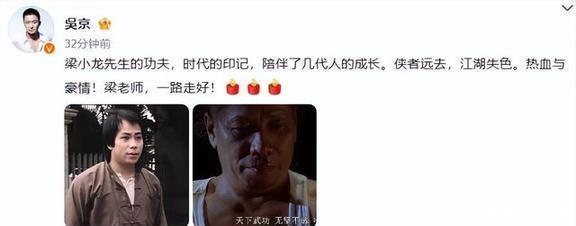 吴京发文表示:梁小龙老师的功夫,真的是那个时代的象征,陪着好几代人一起成长。好汉走了,江湖也没那么热闹了。激情澎湃,心中豪情!梁老师,您一路顺风啊!