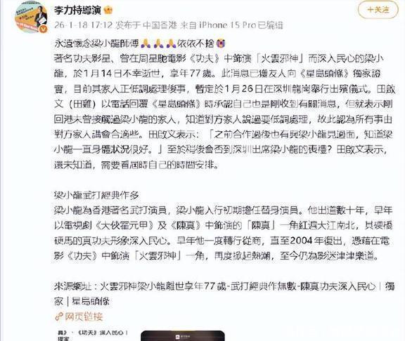 一开始,很多人都不相信这事儿是真的,因为网友发现梁小龙的社交账号最近还在发视频,根本不可能人死了。经过多方确认,梁小龙真的去世了,具体时间是1月14日。遗属遵循他的低调风格,没有大肆宣扬,只是小范围内处理后事,后续的出殡仪式定在1月26日在深圳进行。